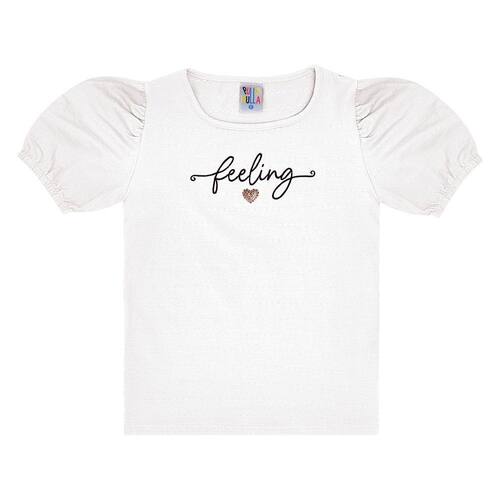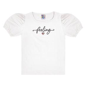 Lindos looks com apenas uma peça! Esta blusa é confeccionada em cotton leve na cor branca, possuí estampa bordada em paetê com escrita “feeling” (sentimento). Sua pequena fashionista vai arrasar no passeio e no look, a diversão vai ser garantida durante o passeio.