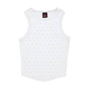 Fresquinha, confortável e fashion esta peça não pode faltar no guarda-roupa das meninas! Confeccionada em ribana com elastano leve, a blusa na cor branca e no modelo regata possuí apliques metalizados na parte frontal da peça. Que tal uma voltinha com a melhor amiga?