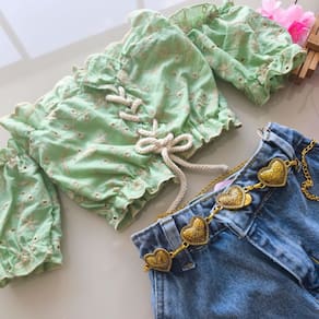 Franzidos e babados nas barras e nos decotes, conferindo um toque feminino e fluido. Amarração frontal com cordões, criando um detalhe ajustável e charmoso. Bordados florais ou em relevo distribuídos pela peça, adicionando textura e um visual artesanal.