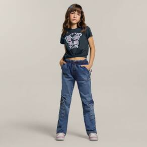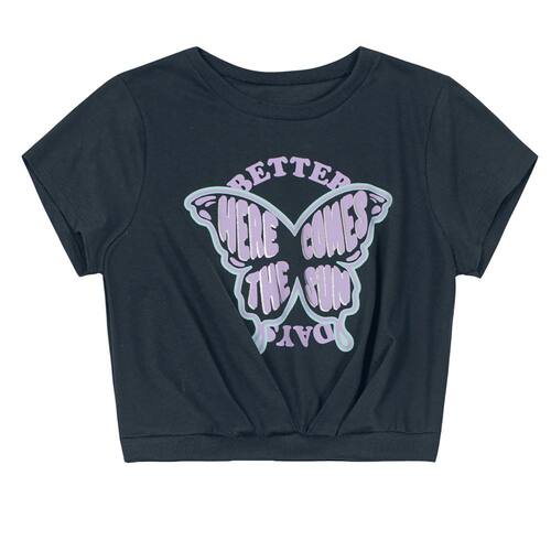 Linda e estilosa a Blusa cropped teen menina confeccionada em malha, conta com mangas curtas, gola redonda e barra ajustada com elástico. Invista e combine com as calças da coleção. Tradução: "Aí vem o sol; Dias melhores"