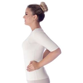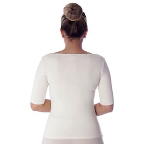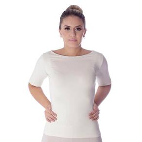 Blusa feminina meia manga decote canoa, cor palha clássica, em tecido LIGHT CO2 biodegradável (fio AMNI SOUL ECO, o primeiro fio de nylon biodegradável do mundo), com fator de proteção solar 50FPS+ UVA e UVB.