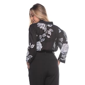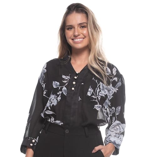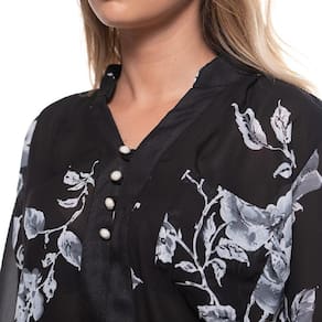 BLUSA feminina TEODORO em musseline com ESTAMPA FLORAL com modelagem ACINTURADA, MANGA LONGA reta, BOLSO, colarinho tipo americano (gola de padre), fechamento frontal com botões de PÉROLA, que arrematam também os punhos, trazendo mais charme e delicadeza à peça. Veste bem com calça como na foto para looks mais Formais e acompanha também saia para um look mais Romântico. Peça muito versátil e chique. Esta blusa é de alta qualidade, com estilo atemporal. Possui acabamento impecável, feito justamente para durar por muitos anos no seu guarda roupa!