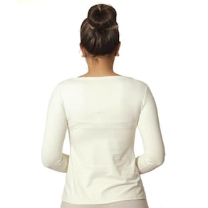 Blusa feminina manga longa decote canoa evasê, cor palha clássica, em tecido LIGHT CO2 biodegradável (fio AMNI SOUL ECO, o primeiro fio de nylon biodegradável do mundo), com fator de proteção solar 50FPS+ UVA e UVB.