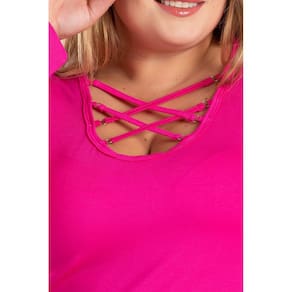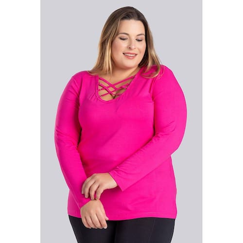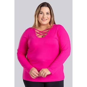 Blusa feminina manga longa produzida em malha de viscose com elastano. Possui boa elasticidade, ótimo caimento, toque macio. Uma peça elegante e que vai valorizar você e seu look, com um decote todo trabalhado em tiras e argolas de metal para dar um toque de elegancia e modernidade.