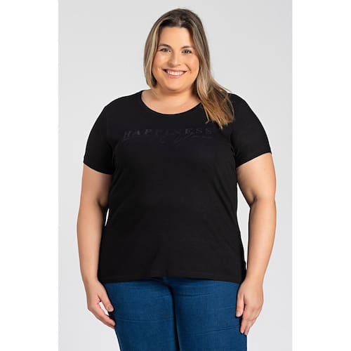 Peça leve, com toque macio, boa elasticidade e estampa em gel trazendo um diferencial, com escrita "happiness looks gorgeous on you".