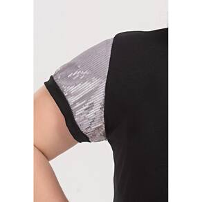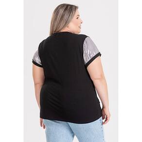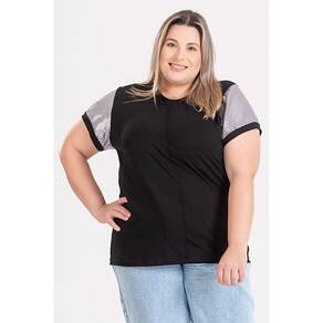 A blusa feminina plus size conta com um lino detalhe de manga em paetê.