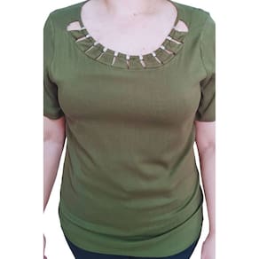 Em um tom verde sofisticado, essa peça é destaque pela gola com detalhe em strass, que adiciona um toque de brilho e charme na medida certa. Confeccionada em tecido leve e confortável, ela une estilo e praticidade para o dia a dia ou ocasiões especiais.