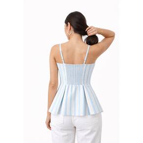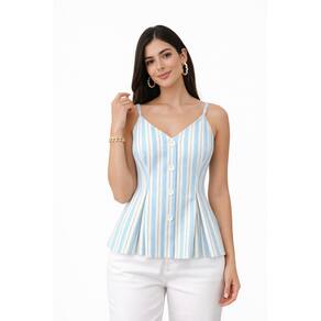 Blusa Feminina Tricoline Listrada Decote V Elegante Moderna - Azul Petróleo - P