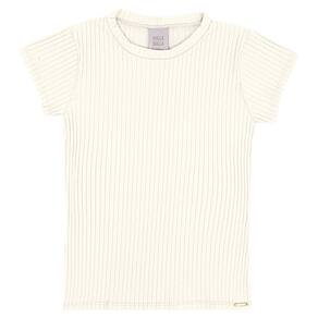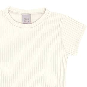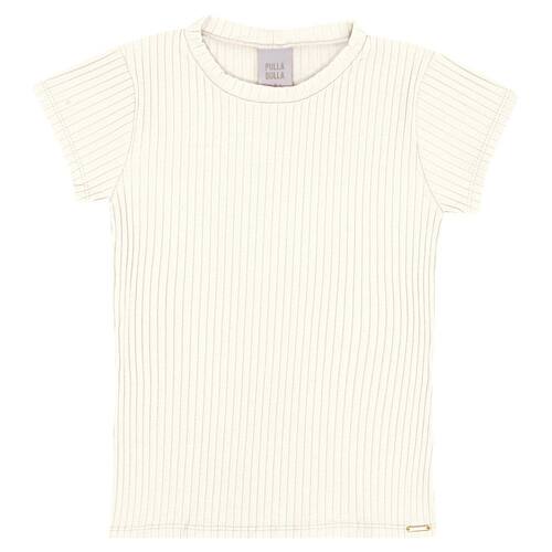 Blusinha básica e fofinha em malha canelada na cor off white, com gola arredondada e placa de metal com identificação Pulla Bulla. Invista nesta peça e a complemente com uma saia ou short da coleção.