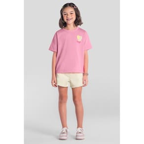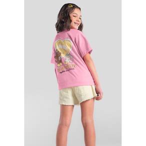 Essa blusa infantil para menina é confeccionada em meia malha macia e traz estampa de ursinho Sweet Goods frontal e nas costas, garantindo um visual divertido e atual. Com modelagem oversized, gola redonda e mangas curtas, é a escolha perfeita para produções casuais com um toque de tendência. Versátil e prática, combina facilmente com diferentes peças do guarda
