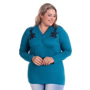 Blusa manga longa desenvolvida em viscose, modelagem larga, decote em "V" frisado logo abaixo, com aplicação termocolante de flores, acabamento e costura no tom. Use-a em várias ocasiões, seja no dia a dia a passeio, trabalho, etc. Este modelo pode ser usado de forma mais justa ao corpo ou ainda mais soltinha, o importante é se sentir a vontade, confortável tendo esta peça e com ela infinitos looks elaborar.