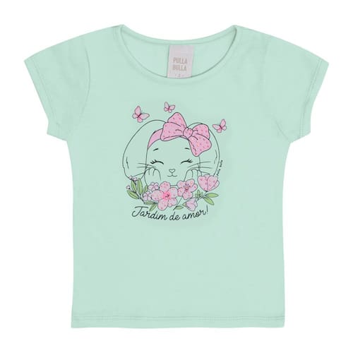Blusinha ideal para os passeios mais divertidos da estação! Confeccionada em tecido meia malha a blusinha possuí estampa frontal de coelhinha na cor tiffany com flores e escrita "Jardim do amor", ótimo para combinar com short, saia ou legging e aproveitar o dia com a priminha.