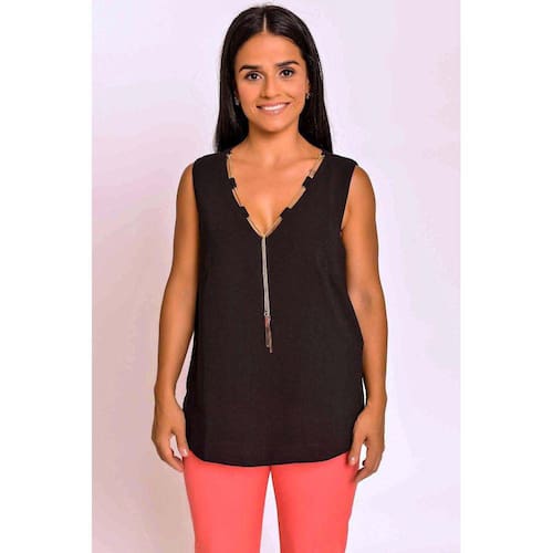 Blusa Regata em Viscose, possui decote em V com detalhe em corrente e pequenas aberturas dos lados A Blusa regata em viscose é uma peça que combina com tudo, ótimo para usar em dias quentes, confortável, super versátil. Pode ser usada com jaquetas e carrega leveza. Código do Produto: 222234600205