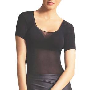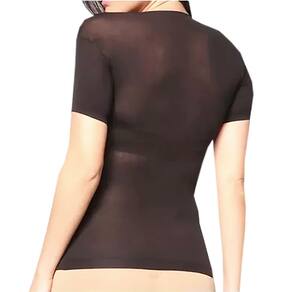 Blusa Segunda Pele Manga Curta Decotada Fio 40 Tamanho Único 38-44. Produto em tamanho único que atende numeração: 38 a 44. Cor disponível: Preto. Confeccionada com malha finíssima para ser usada em baixo da roupa ou com sobreposições, permitindo versatilidade no visual. Modelagem em manga curta, possui transparência, elasticidade e caimento justo. Qualidade Selene. Modelo: Manga curta decotada Fio 40. Composição: 98% Poliamida e 2% Elastano. Lavagem à mão. Produto delicado. Contém: 1 unidade na cor preta. Fotos ilustrativas e reais do produto.