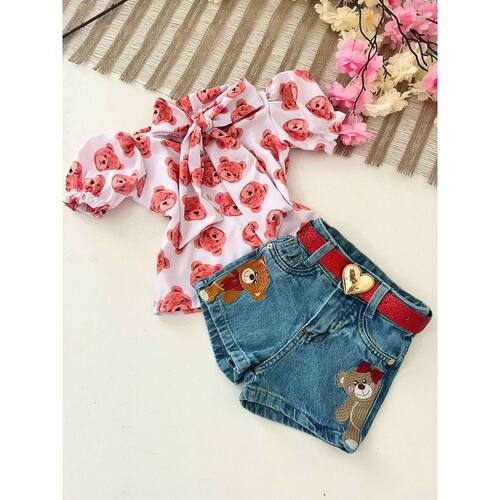 Blusa infantil feminino social manga princesa, gola alta com amarração estampa realista ursinho deixando o look perfeito, super divertido, uma fofura, sua princesa vai ficar apaixonada.