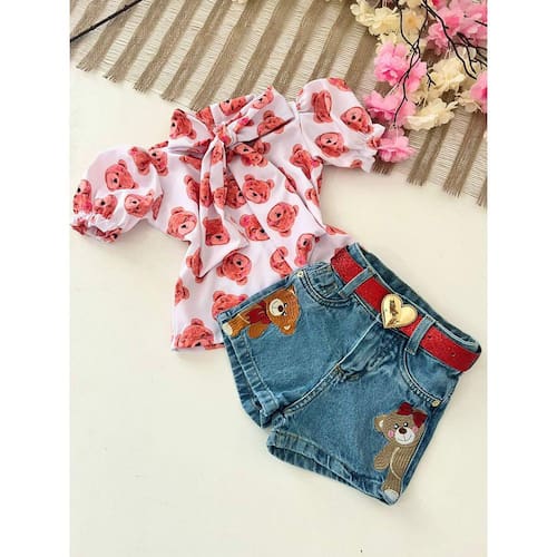 Blusa infantil feminino social manga princesa, gola alta com amarração estampa realista ursinho deixando o look perfeito, super divertido, uma fofura, sua princesa vai ficar apaixonada.