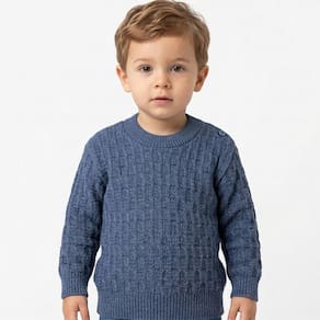 Blusa Trabalhada Tricô Kids Ombro Botão feito em tecido algodão e acrílico, gola redonda, manga longa e etiquetas personalizadas.