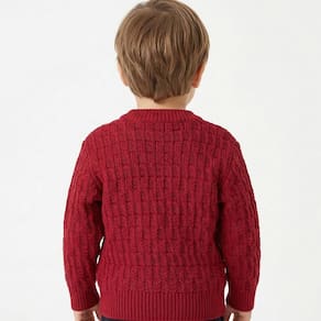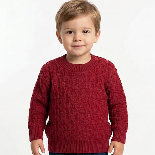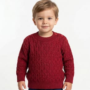 Blusa Trabalhada Tricô Kids Ombro Botão feito em tecido algodão e acrílico, gola redonda, manga longa e etiquetas personalizadas.