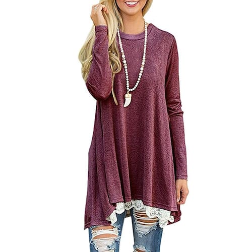 - Bainha dividida de renda na frente, vestidos midi acima do joelho, túnica básica de manga comprida, camisa confortável de ajuste solto, túnica plus size para mulheres, blusas longas para usar com leggings