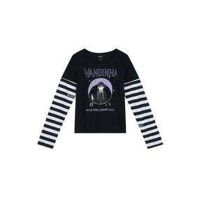 Cheia de estilo e personalidade blusa infantil menina confeccionada em malha, a peça conta com estampa frontal em glitter da Wandinha, mangas longas com detalhe de sobreposição e gola redonda. Esta peça é perfeita para as pequenas que adoram personagens cativantes. Esta peça é perfeita para as pequenas que adoram essa personagem que ganhou o coração de muitas.
