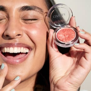 - FAÇA AS BOCHECHAS SE DESTACAREM: agite este pó de blush da Clinique em um pincel e espalhe-o sobre as maçãs do rosto. Misture suavemente a cor até as maçãs do rosto e as têmporas.