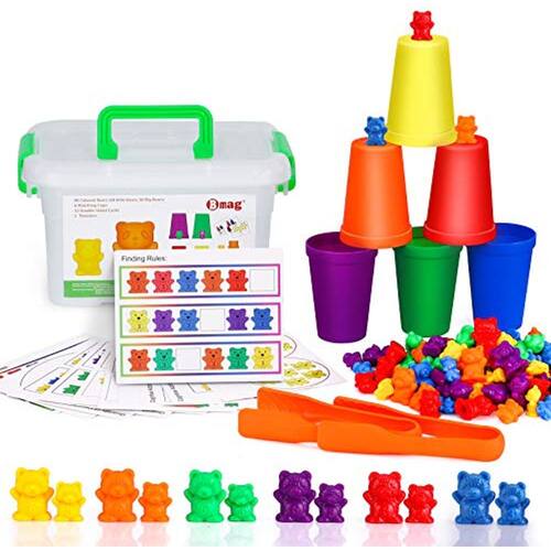 Bmag Contagem de ursos com copos de classificação correspondentes, número de reconhecimento de cor STEM brinquedo educacional para crianças, brinquedo de aprendizagem pré-escolar com 90 ursos, 2 pinças, 11 cartões de atividade, 1 caixa de armazenamento