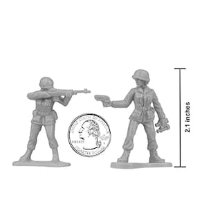 Apresentando a SÉRIE DE COLETORAS MULHERES DO EXÉRCITO DE PLÁSTICO DA BMC Toys. Este novo conjunto de figuras femininas é projetado no estilo clássico dos melhores homens do exército de plástico de meados do século XX. O conjunto inclui 36 peças em 22 poses diferentes, juntamente com um cão de trabalho com acessórios de coleira e maca. As poses incluem Pathfinder Captain, Combat Pathfinder Captain, Standing Rifleman, Kneeling Rifleman, Prone Rifleman, Kneeling Sharpshooter, Prone Sharpshooter, Advanceing with Bayonet, Grenadier, Bazooka Operator, Running Riflemen, Combat Medic, Low Crawling, Radio Operator, Wounded Soldier, Light Machine Gunner, Nurse, Corpsman, Mechanic, Military Working Dog, MWD Handler, e acessório de maca. Estas tropas têm até 2,1 polegadas de altura, têm aproximadamente 1:32 de escala, e feitas de plástico LDPE cor cinza ligeiramente flexível. Os uniformes e equipamentos são modelados por volta do período de 1960 e se encaixam com as eras da Guerra da a e do Início da Guerra do Vietnã, bem como o treinamento na década de 1970. Os rostos e figuras são inspirados por soldados reais do início dos anos 1900 até os dias atuais. Este é um conjunto de verdadeiros heróis de plástico americanos, destinados a serem criados, derrubados, pegos e jogados nos anos seguintes. Embalado em polibag com placa de inserção e recomendado para maiores de 5 anos.