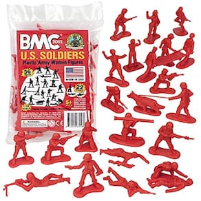 Apresentando a SÉRIE DE COLETORAS MULHERES DO EXÉRCITO DE PLÁSTICO DA BMC Toys. Este novo conjunto de figuras femininas é projetado no estilo clássico dos melhores homens do exército de plástico de meados do século XX. O conjunto inclui 36 peças em 22 poses diferentes, juntamente com um cão de trabalho com acessórios de coleira e maca. As poses incluem Pathfinder Captain, Combat Pathfinder Captain, Standing Rifleman, Kneeling Rifleman, Prone Rifleman, Kneeling Sharpshooter, Prone Sharpshooter, Advanceing with Bayonet, Grenadier, Bazooka Operator, Running Riflemen, Combat Medic, Low Crawling, Radio Operator, Wounded Soldier, Light Machine Gunner, Nurse, Corpsman, Mechanic, Military Working Dog, MWD Handler, e acessório de maca. Estas tropas têm até 2,1 polegadas de altura, têm aproximadamente 1:32 de escala, e feitas de plástico LDPE cor vermelha ligeiramente flexível. Os uniformes e equipamentos são modelados por volta do período de 1960 e se encaixam com as eras da Guerra da a e do Início da Guerra do Vietnã, bem como o treinamento na década de 1970. Os rostos e figuras são inspirados por soldados reais do início dos anos 1900 até os dias atuais. Este é um conjunto de verdadeiros heróis de plástico americanos, destinados a serem criados, derrubados, pegos e jogados nos anos seguintes. Embalado em polibag com placa de inserção e recomendado para maiores de 5 anos.