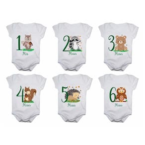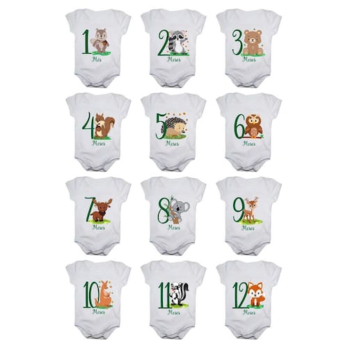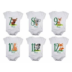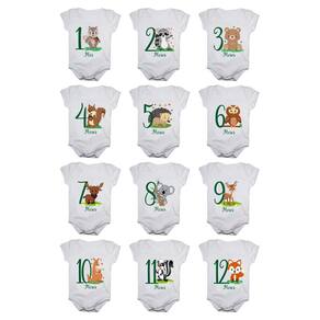 Body de bebê mesversario - kit com 12 peçasTecido: malha 96% poliéster, 04% elastano.Toque macio e confortável.Estampa sublimada de alta qualidade.Tamanhos: P ao GG.Enviamos da seguinte forma:1 a 2 meses P / 3 a 5 meses M / 6 a 8 meses G / 9 a 12 meses GG.