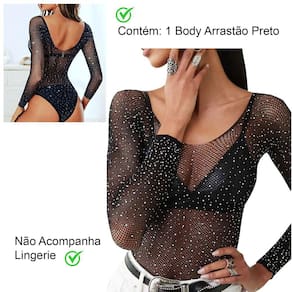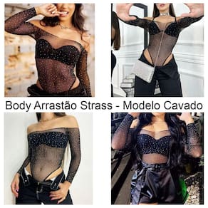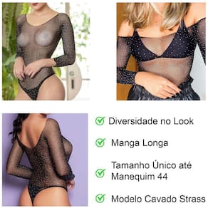 Possui strass em toda a peça, modelo cavado, manga longa.