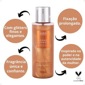O Body Splash Shimmer Collection Bronze Goddess da Kiss New York é uma fragrância floral gourmand sofisticada, que combina a cremosidade do leite de coco, o toque doce das amêndoas caramelizadas e a luminosidade da lavanda. Sua fórmula com micropartículas de glitter dourado adiciona um brilho sutil à pele, realçando sua beleza natural.
