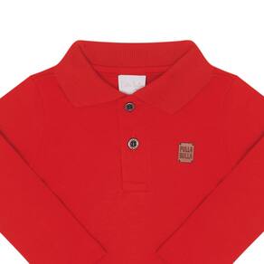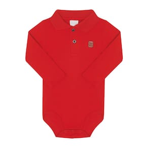 Com gola polo em tecido suedine na cor vermelho, seu pequeno cavalheiro vai estar pronto para qualquer ocasião especial com esse look. O body possuí manga longa e aplique termocolante no canto esquerdo do peito de quem veste e para facilitar o momento de troca possuí também abertura entre as pernas e fechamento com botões de pressão! \n