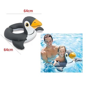 Essa boia inflável possui dimensões aproximadas de 64 cm de comprimento x 64 cm de largura, sendo recomendada para crianças a partir de 3 anos de idade. Seu design de pinguim preto é encantador e atrativo para os pequenos.