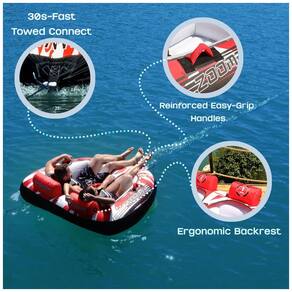 TUBO REBOCÁVEL MAIS O assento inovador do cockpit da Zoombros com design ergonômico do encosto aumenta a segurança e a estabilidade. Você não deve se preocupar em ser lançado. É para crianças e adultos que desejam uma pilotagem segura e confortável. CONSTRUÇÃO EXTRA ROBUSTA Este tubo divertido para a família possui quatro alças de espuma antiderrapante e totalmente coberta em nylon forte de 840 denier em torno de uma bexiga de PVC resistente. A capa de nylon com costura dupla pode lidar com desgaste sério. A drenagem inferior pode impedir que o tubo do barco submerja e arraste lentamente. SISTEMA DE REBOQUE ULTRA RÁPIDO O conector de reboque dianteiro para serviço pesado leva apenas 30 segundos para se conectar ao cabo de reboque. Possui válvula de segurança de velocidade para inflação e deflação rápidas e fáceis, deixa seu tubo rebocável pronto em pouco tempo Este tubo de água é compatível com bombas únicas no Marca: Não Informado