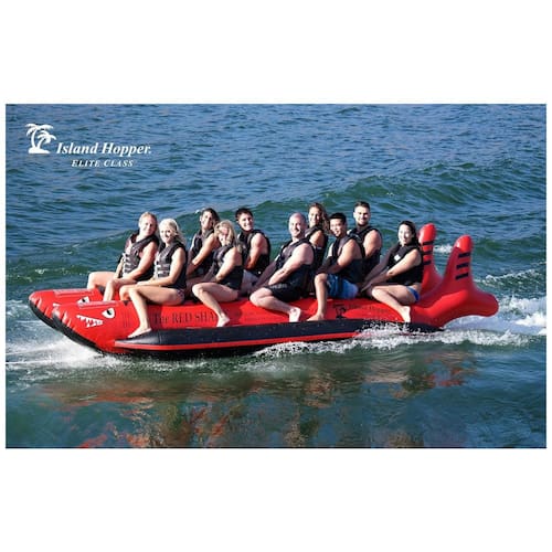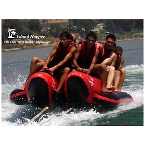 ENVIAMOS NO MESMO DIA ÚTIL QUE O PEDIDO DO FABRICANTE DA CALIFÓRNIA. O banana boat Red Shark de 10 homens redesenhado é mais largo e mais estável, construído para uma excelente pré forma em condições de águas agitadas e uso oceânico. Material Resistente a UV resistente a UV reforçado 1100 denier 1.1 Litros PVC. Material denso resistente a perfurações, reforçado em áreas de alta tensão. Elite Class Costuras soldadas para durabilidade e longevidade. Anéis de tração de aço inoxidável, arnês de reboque com alavanca de aço Marca: Não Informado