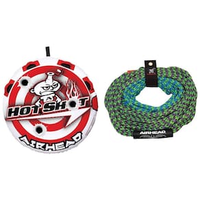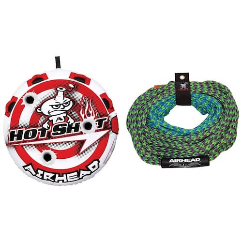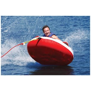 Diâmetro de 145 cm, projetada para 1 adulto ou 2 crianças pequenas. Feita com capa de nylon resistente com costura dupla. Inclui cabo de reboque de 15,2 m ou 18,3 m com resistência à ruptura de até 1.882 kg, além de suporte para armazenamento. Equipado com 4 alças de luxo com protetores de juntas em neoprene para maior conforto e segurança. A corda de reboque é fabricada em polipropileno pré-esticado, resistente a raios UV e com 16 fios, oferecendo opções de comprimento de 15,2 m ou 18,3 m. Conta com válvula de segurança de alta velocidade para enchimento e esvaziamento rápidos.