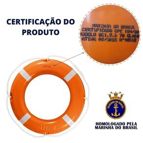 Informações adicionais Classe i Tamanhos: 70cm Diâmetro externo: 70cm Homologado pela marinha do brasil Utilizado em embarcações de mar aberto Carga de ruptura mínima: 500kg Confeccionada em polietileno fundido com proteção uv e preenchimento interno de poliuretano expandido. Material imputrescível, resistente a fungos, água do mar, água doce, petróleo e seus derivados. Fita refletiva 3m. Certificado solas 164.018/6/1; uscg 164.018/8/0. Cabo de polipropileno de 10mm trançado na bóia, fixo em quatro pontos.