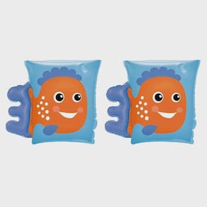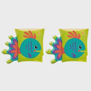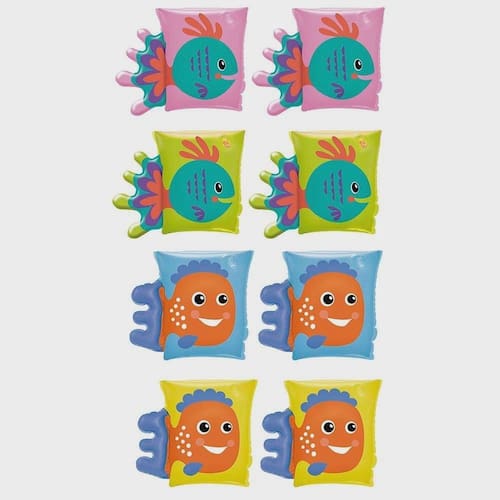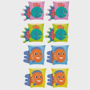 Com estampa de peixinho, as Boias de Braço Bichinhos da Mor possuem quatro diferentes opções de cores predominantes: Azul, Amarelo, Rosa e Verde. Possuem duas câmaras de ar independentes, o que dá mais segurança para os pequenos, pois em caso de furo ou esvaziamento acidental de uma delas a outra câmara garante sua estabilidade na água.