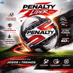 A Bola Campo Penalty Líder XXVI foi desenvolvida para jogadores que buscam conforto, resistência e durabilidade em jogos e treinos em campo. Seu design moderno alia tecnologias Penalty e materiais de alta qualidade para garantir desempenho consistente durante toda a partida. A construção Ultra Fusion elimina costuras, reduz a absorção de água e mantém a bola mais uniforme e resistente. Com laminado em PU, proporciona excelente controle e precisão nos passes e finalizações.