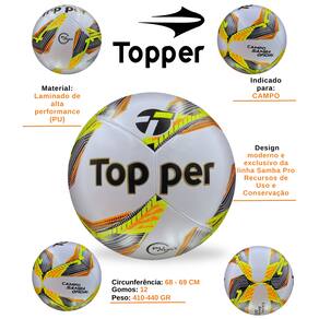 Características: - Marca: Topper - Modelo: Samba Oficial - Indicação: Futebol de Campo - Construção: COLADA - Circunferência: 68 – 69 cm (oficial) - Peso: 410 – 440 g (oficial) - Gomos: 12 - Calibragem: 9 – 11 libras - Material: Laminado de alta performance (PU) - Toque: Macio e preciso, garantindo maior conforto no domínio e nos chutes