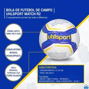 A Bola de Futebol de Campo Uhlsport Match R2 foi desenvolvida com uma câmara de látex injetada que oferece maior equilíbrio e melhor retenção de ar, forro com fios sintéticos para garantir maior durabilidade, oferece conforto em cada toque proporcionado por uma camada de EVA com 2.5mm de espessura, o material externo feito com micro células sintéticas oferece muita durabilidade, o miolo é removível e todas as peças montadas com o sistema de termocolagem em dupla camada para perfeita junção das peças com 0% absorção de água e revestimento com sistema de alta frequência que proporciona maior precisão na trajetória da bola.