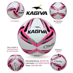 Caracteristicas: - Marca: Kagiva - Modalidade: Campo - Laminado: Pu Pro - Peso: 410-440g - Gomos: 12 - Circuferencia: 68-69 cm - Calibragem: 10-11 Libras - Miolo substituivel e lubrificado