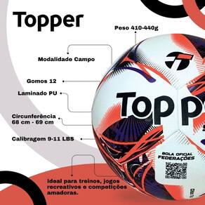 CARACTERÍSTICAS: - Marca: Topper - Modalidade: Campo - Material: PU HS/ 1.1 MM - Peso: 410-440g - Gomos: 12 - CIircuferencia: 68-69 cm - Calibragem: 9-11 LBS - Camara: Butil