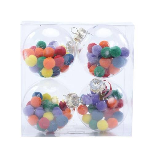 Descrição: Conjunto de 4 bolas transparentes com pompons coloridos na parte interna, apresentando pompons nas cores azul, verde, vermelho, laranja e roxo.
