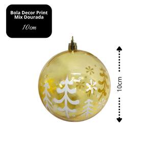 Com 10cm de diâmetro, é uma bola de tamanho grande que se destaca na composição de árvores, guirlandas ou arranjos decorativos. Fabricada em material translúcido com acabamento dourado e aplicação de estampa branca, une beleza e qualidade em um único item.