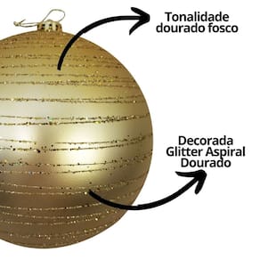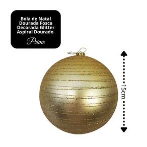Destaque sua decoração com esta bola natalina grande de 15cm de diâmetro, perfeita para árvores maiores, arcos de festões e até fachadas. O acabamento em Dourada fosco com detalhe em espiral glitter dourado traz brilho e sofisticação para composições natalinas modernas ou tradicionais.