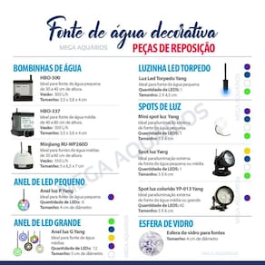 veja outros produtos compatíveis com sua fonte de água: bomba submersa hbo-300 300 l/h bomba submersa hbo-337 500 l/h anel luz led para fonte de água luzinha led torpedo para fonte de água spot de luz yang - para dar ainda mais destaque na peça - basta ligar o spot na tomada e direcioná-lo para a fonte