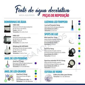 Veja outros produtos compatíveis com sua fonte de água: Bomba submersa HBO-300 (300 L/h) Bomba submersa HBO-337 (500 L/h) Anel luz led para fonte de água Luzinha led torpedo para fonte de água Spot de luz Yang - para dar ainda mais destaque na peça - basta ligar o spot na tomada e direcioná-lo para a fonte