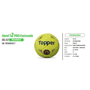 Bola Handebol Topper Hand T2 Pro CosturadaChegou a hora de mostrar suas jogadas com a bola de Handebol Topper Pro T2.Seu design e cor proporcionam maior nacionalidade ao produto, permitindo que você mostre seu estilo e habilidades dentro das quadras.Características:- Laminado: PU - PVC- Construção: Costurada a Mão- Câmara: Airvility - Camada Interna: Forro 3x Borracha Natural- Miolo: Substituível - Lubrificado- Peso: 325 - 390 gr- Gomos: 32- Circunferência: 54 - 56 cm- Calibragem: 04 - 05 LibrasOBS: A bola pode vir com a calibragem alterada.