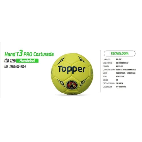 Bola Handebol Topper Hand T3 Pro CosturadaChegou a hora de mostrar suas jogadas com a bola de Handebol Topper Pro T3.Seu design e cor proporcionam maior nacionalidade ao produto, permitindo que você mostre seu estilo e habilidades dentro das quadras.Características:- Laminado: PU - PVC- Construção: Costurada a Mão- Câmara: Airvility - Camada Interna: Forro 3x Borracha Natural- Miolo: Substituível - Lubrificado- Peso: 425 - 475 gr- Gomos: 32- Circunferência: 58 - 60 cm- Calibragem: 04 - 05 LibrasOBS: A bola pode vir com a calibragem alterada.